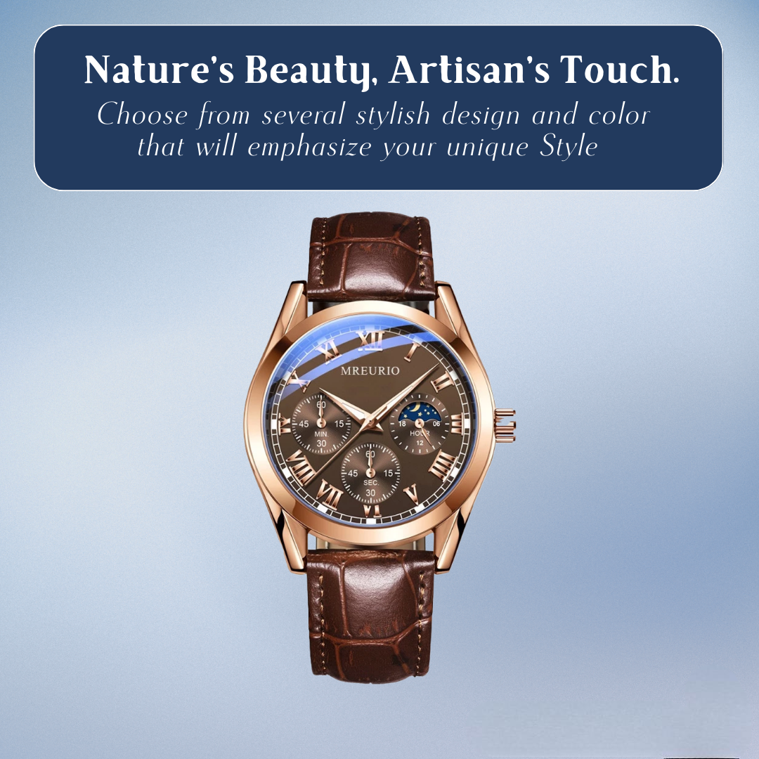 Stephen combines classic sophistication with advanced features. Its rich brown dial and matching leather strap offer a warm, refined look. The moon phase complication and multiple subdials provide practical functions wrapped in stylish design.